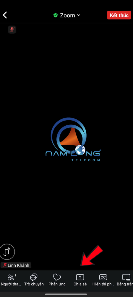 Bước 2: Tại giao diện chính cuộc họp. Bấm vào nút bên dưới màn hình có dấu mũi tên hướng lên “Chia sẻ màn hình”.