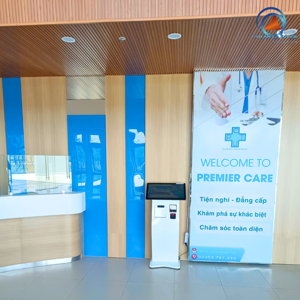 Tiếp đến là Kiosk tại bệnh viện và phòng khám, tuy nhiên thì thiết bị này chỉ thường được dùng tại các bệnh viện tuyến tỉnh, trung ương và phòng khám tư nhân. Một phần là do chi phí đắt đỏ, đồng thời tại các khu vực bệnh viện này thường xuyên gặp tình trạng quá tải. Và máy Kiosk giúp rút ngắn quá trình tiếp đón người bệnh, đồng thời cải thiện trải nghiệm cho bệnh nhân.